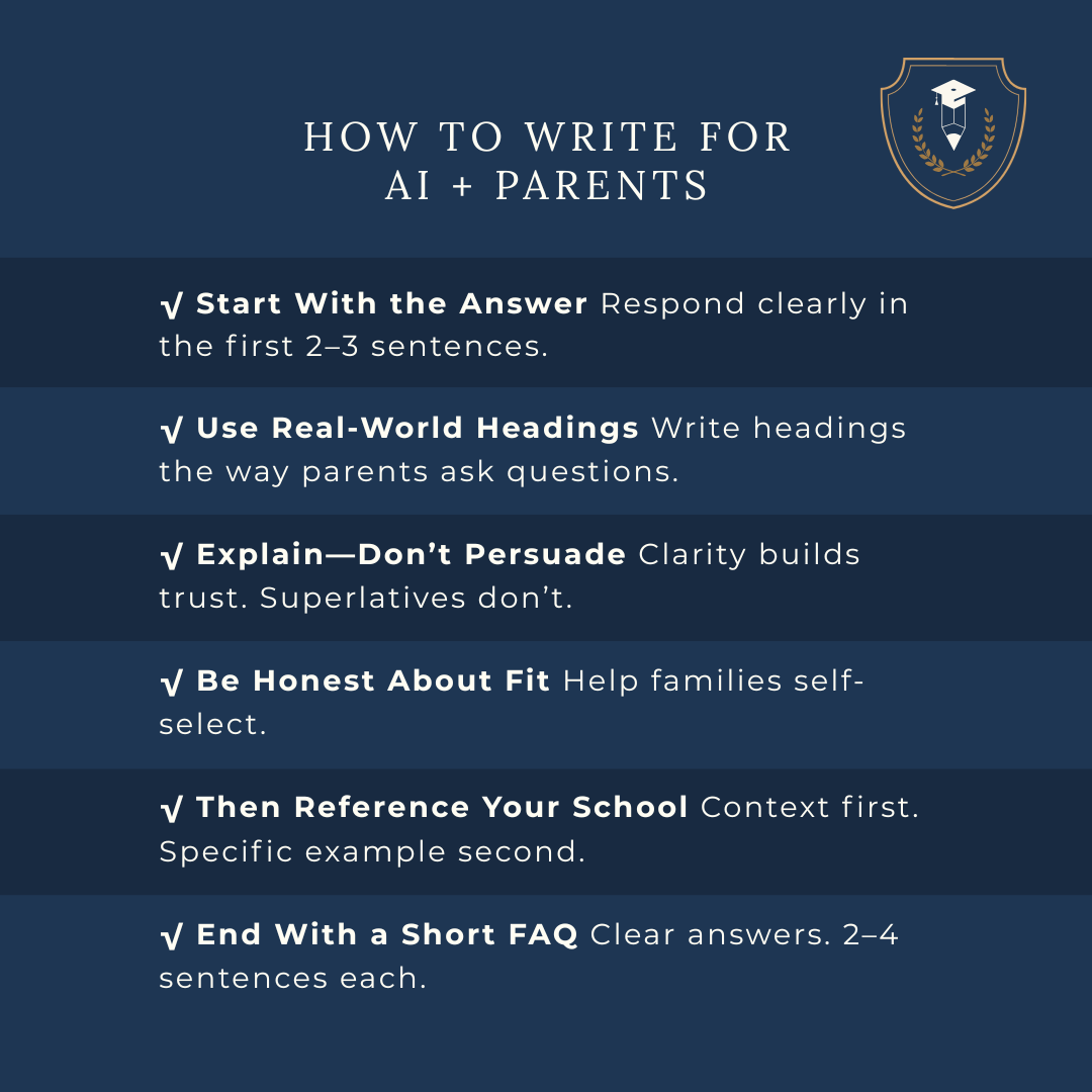 The good news: schools don’t need to chase trends or write like marketers to be included. They simply need to answer parent questions clearly and directly.
